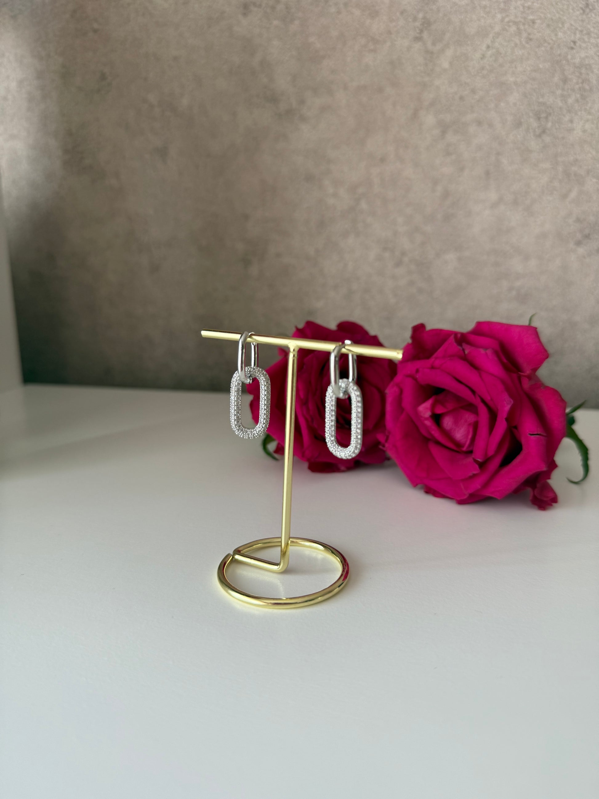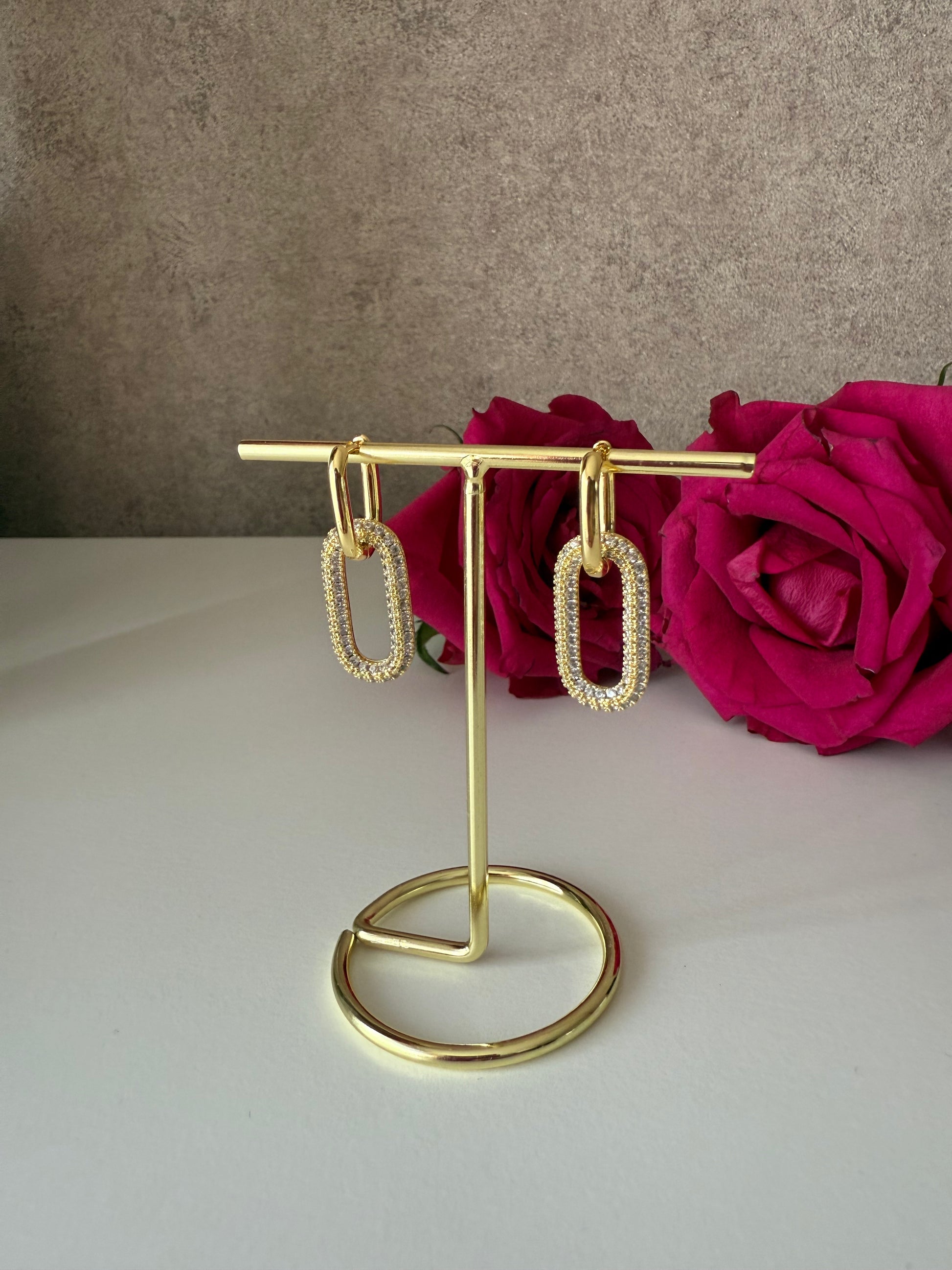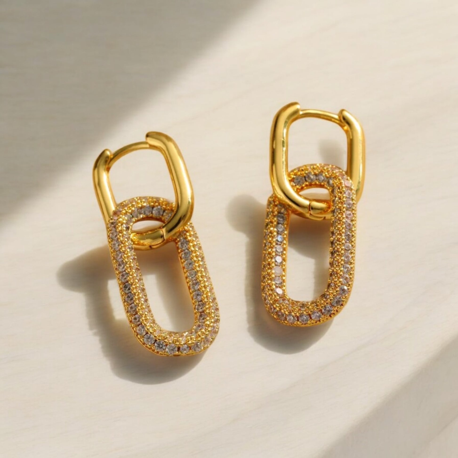Diese glamourösen Ohrringe vereinen klare Kanten mit funkelndem Glanz. Die Kombination aus goldener Gliederoptik und feinen Zirkonia-Steinen macht sie zu einem stilvollen Hingucker – ob als Statement-Piece oder eleganter Alltagsbegleiter.