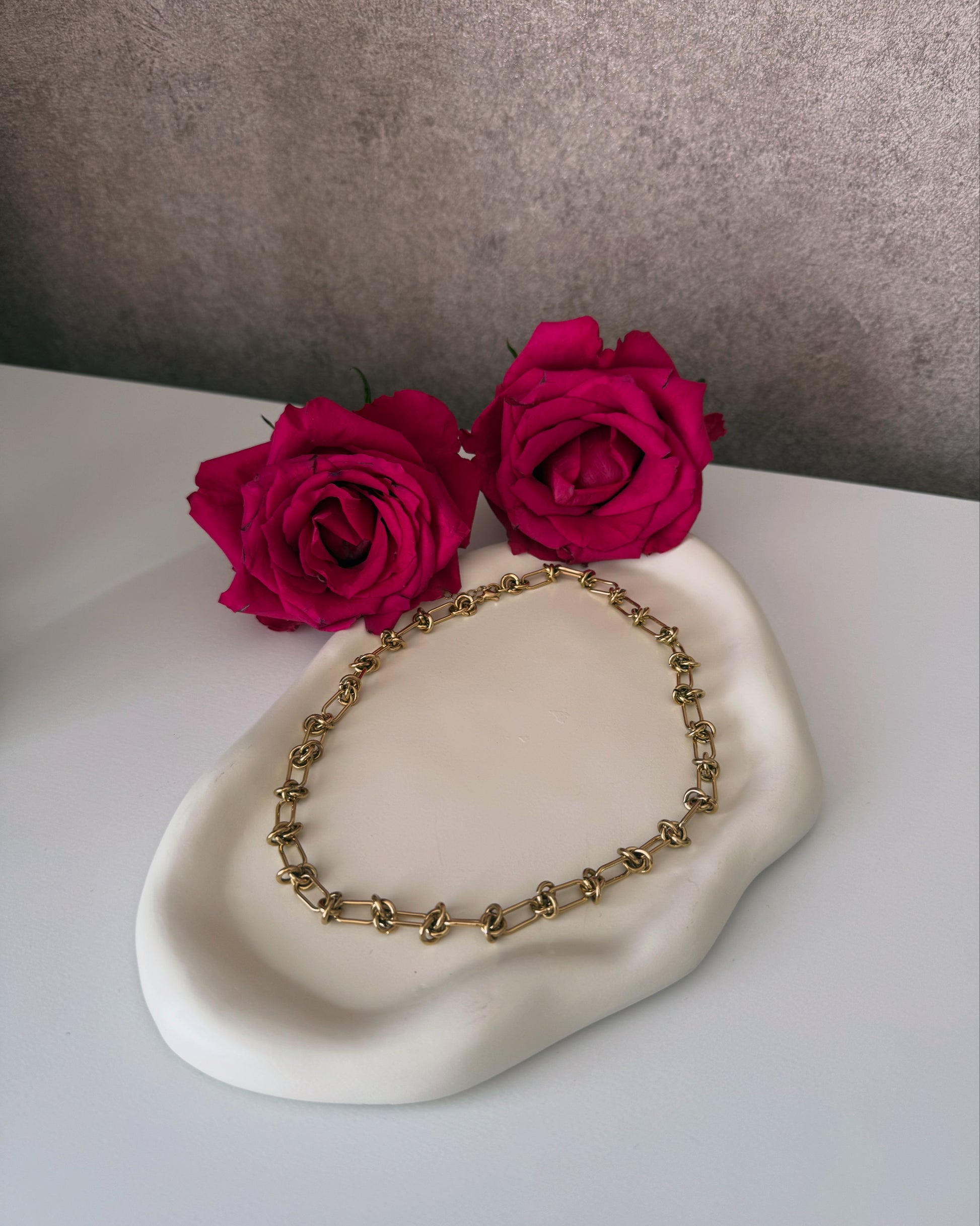 Unsere Luzia-Kette ist ein ausdrucksstarkes Statement-Piece für jeden Look. Hergestellt aus robustem Edelstahl und mit 18K-Gold veredelt, vereint sie Eleganz mit langlebiger Qualität. Mit ihrem Gewicht von 16g spürt man sofort die hochwertige Verarbeitung – perfekt für stilbewusste Frauen, die auffallen möchten, ohne Kompromisse bei Komfort und Haltbarkeit einzugehen.